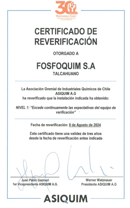 En Agosto 2024, fueron Reverificadas FOSFOQUIM Planta Padre Hurtado, FOSFOQUIM Planta Talcahuano y FOSFOQUIM FUMIGACIONES obteniendo nivel 1: “Cumple los requisitos del Sistema de Gestión de Responsible Care”.